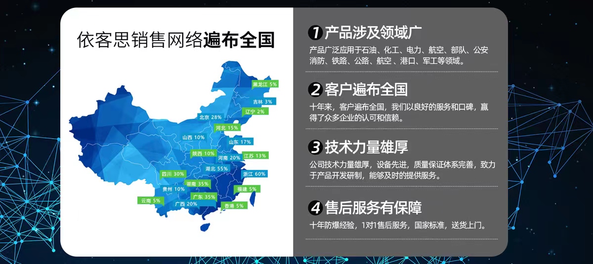 依客思防爆專注于防爆產(chǎn)品的研發(fā)、生產(chǎn)與銷售,主要產(chǎn)品有:防爆操作柱、BXCQ防爆靜電釋放儀、BZC系列防爆操作柱、不銹鋼現(xiàn)場操作箱、BXM(D)防爆照明(動力)配電箱、BXX防爆檢修箱、BXJ防爆接線箱、LED防爆燈、防爆管件、防爆風(fēng)機等產(chǎn)品,型號規(guī)格齊全,廣泛適用于煤炭、電力、醫(yī)藥、石油、化工、航空等領(lǐng)域。我公司產(chǎn)品質(zhì)量過硬,價格實惠,銷售范圍廣,且與各大型企業(yè)建立了良好的合作關(guān)系,同時還遠(yuǎn)銷中、東亞和北美等地區(qū),深受用戶喜愛與青睞。